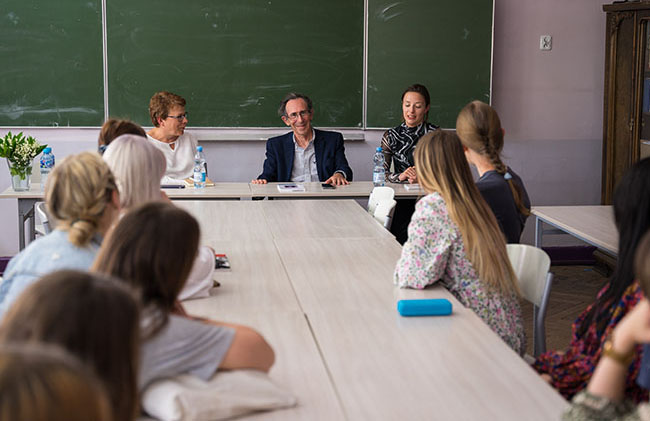 (Pan Georges Mayer, pani doktor Ewa Wiatr oraz pani Julia Brzóska podczas spotkania
